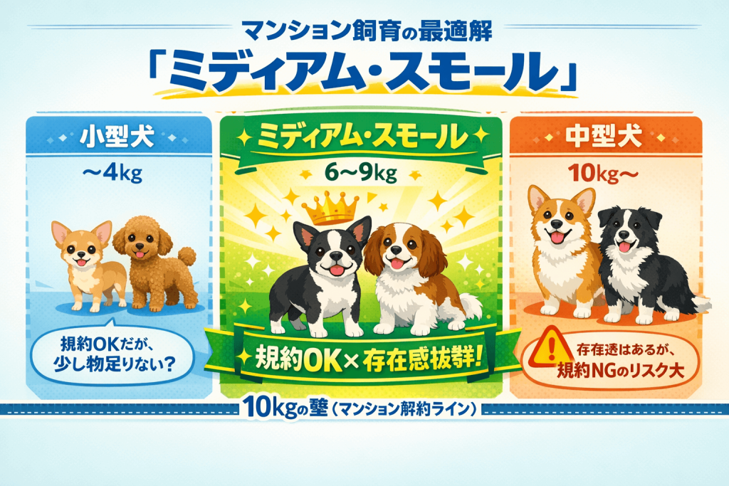 このカテゴリの犬種を選べば、マンション管理規約の「10kg以下」を遵守しつつ、あなたが求めている「中型犬並みの抱き心地と存在感」を十分に満たす(Solution)ことができます。